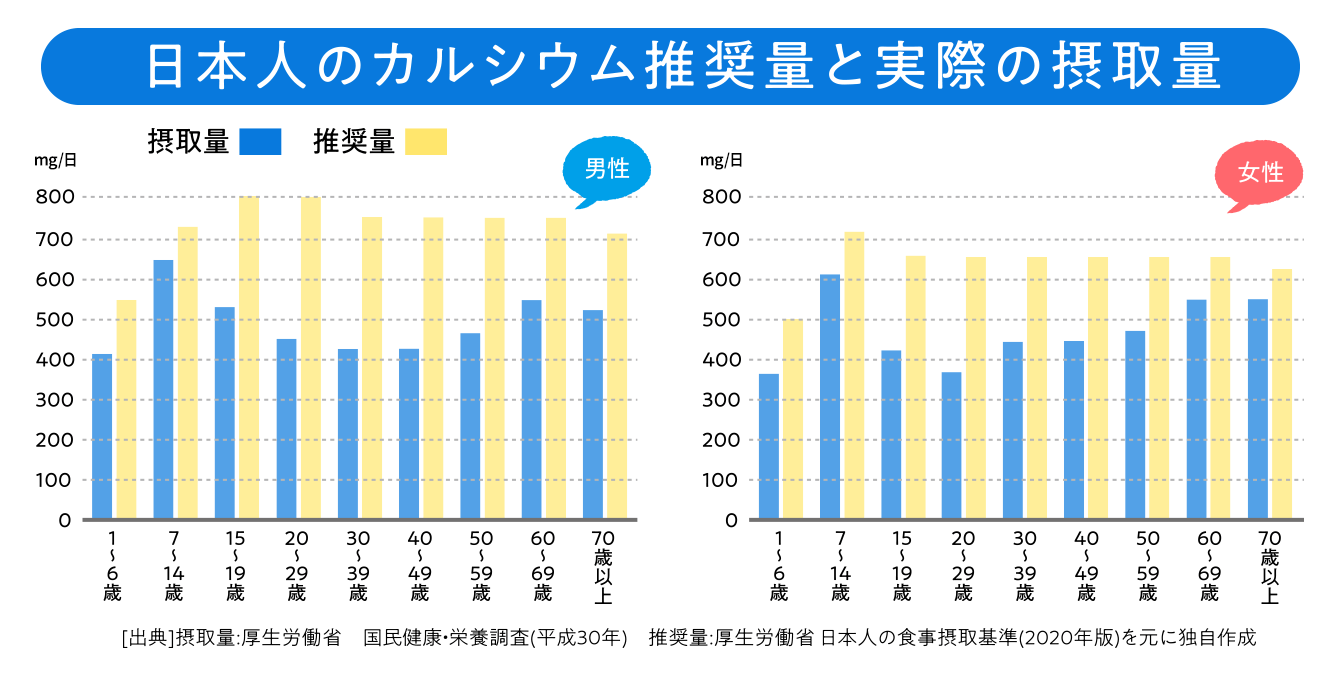 私たちの毎日に欠かせない重要な栄養素であるにも関わらず、下のグラフを見てもわかる通り、日本人はどの年齢でも男女ともにカルシウムが大きく不足しています。