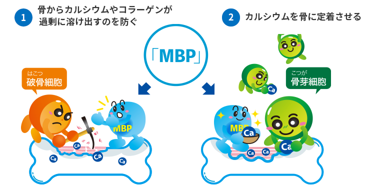 「MBP」は牛乳にごくわずか(約0.005%)に含まれる機能性たんぱく質で、破骨細胞の過剰な働きを抑え、骨芽細胞を支える方向に作用することが報告されています。