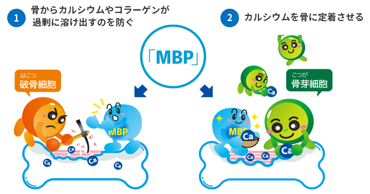 さらに骨を強くするには、「MBP」の摂取も役立ちます。「MBP」は牛乳にわずかに含まれる機能性たんぱく質で、骨代謝をアップして骨密度を高める効果が研究で確認されています。