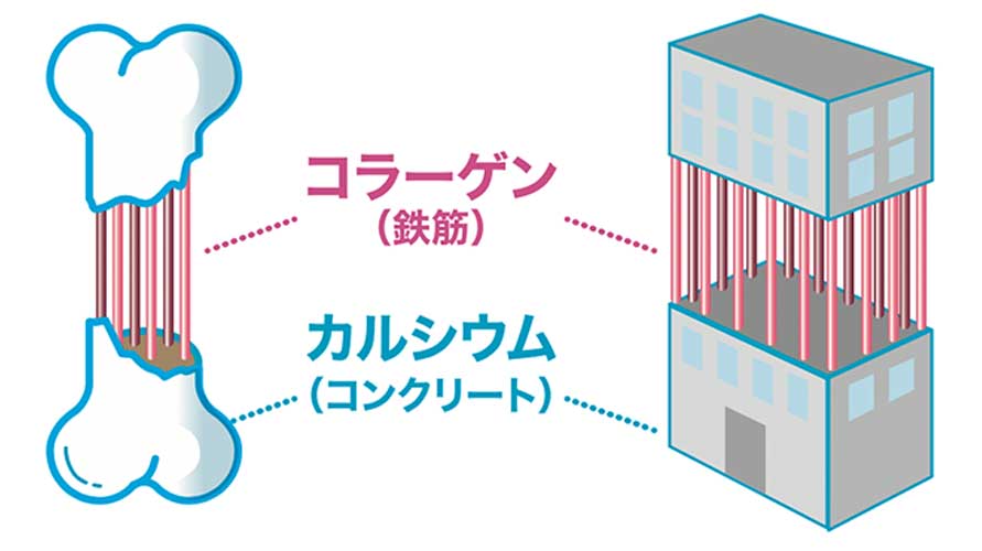 骨の構造は、よくビルやマンションに例えられます。ビルが単なるセメントの塊ではなく、丈夫な鉄筋にしっかりとコンクリートがくっつくことで強くなるのととっても良く似ていて、骨も単なるカルシウムの塊ではなく、鉄筋の役割をするコラーゲンにカルシウムがしっかりくっついて強い骨になっていきます。