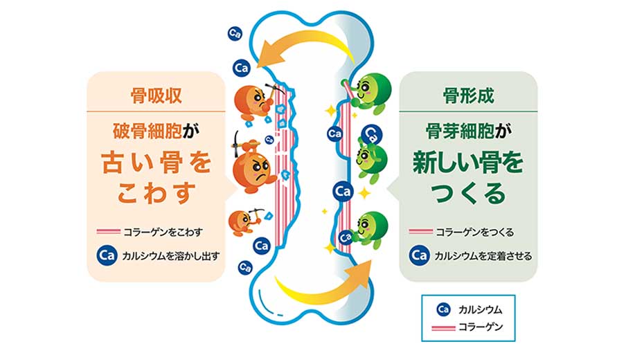 いよいよ骨の生まれ変わりについてです。骨の生まれ変わりに重要な役割を果たすのが、「骨(こつ)芽(が)細胞」と「破(は)骨(こつ)細胞」という2つの細胞です。